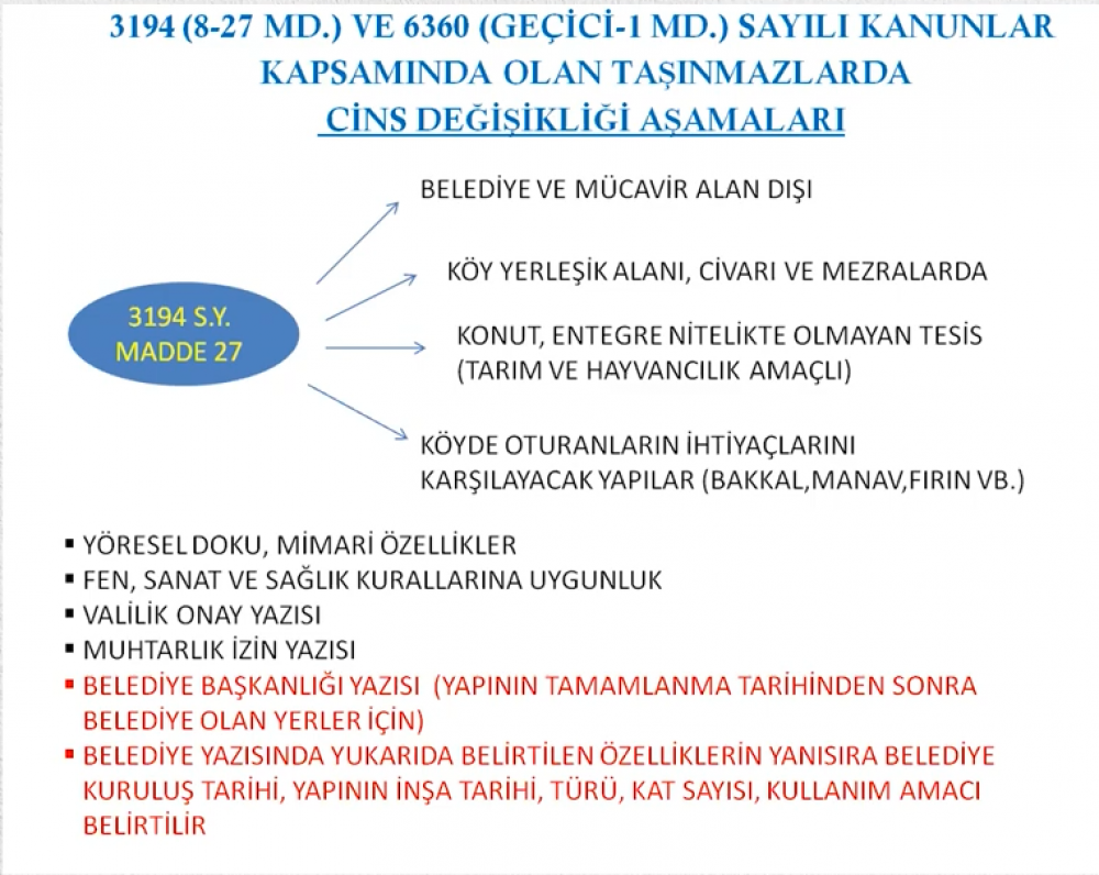 – Belediye ve mücavir alanlar dışında sadece köy nüfusuna kayıtlı ve köyde sürekli oturanların köy yerleşik alanları ve civarında ve mezralarda konut, hayvancılık veya tarımsal amaçlı yaptıkları yapılara ilişkin cins değişikliği taleplerinde, inşa edilen yapının fen ve sağlık kurallarına uygun olduğuna dair valilik görüşü ve yapının bulunduğu köy muhtarlığından izin yazısı aranır. Ancak bu şartları taşıyan ve yapının tamamlandığı tarihten sonra belediye olan yerlerde belediyenin, yapının yapım yılını, fen ve sağlık kurallarına uygunluğunu ve belediyenin kuruluş tarihini belirten yazısına istinaden işlem yapılır,